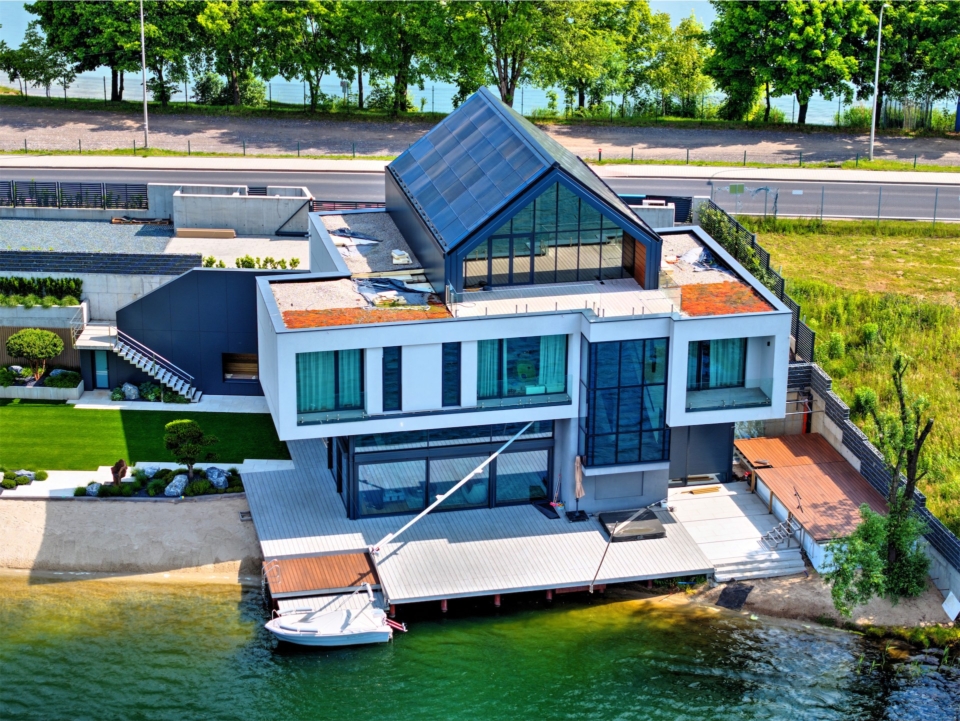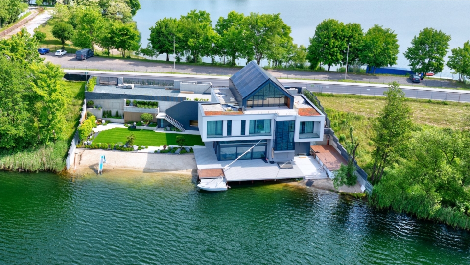The house blends into the lake landscape, the living room smoothly morphs into the large terrace on the water, your own abeach. A dazzling view from every window, every day.